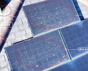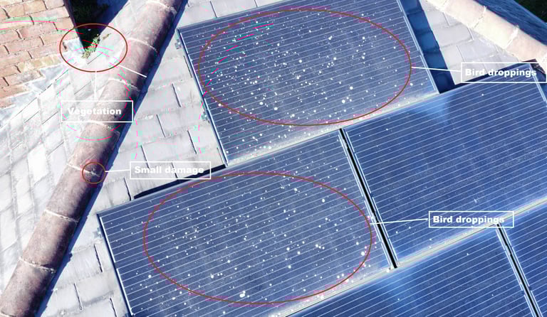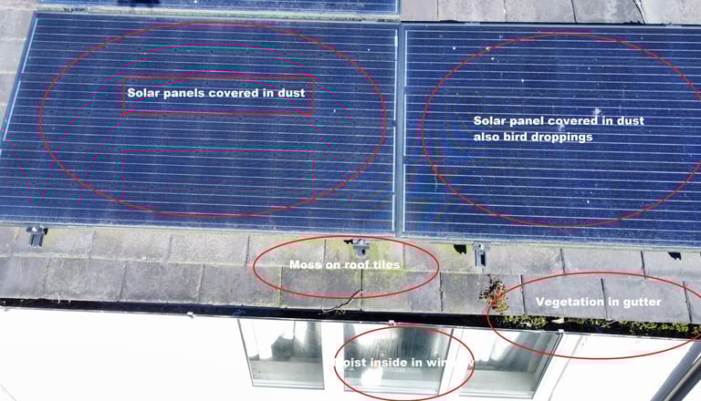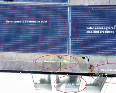 ✅ Summary: The roof shows signs of biological growth (moss and lichen), deteriorated mortar requiring repointing, and debris accumulation under solar panels. Addressing these issues will improve roof longevity, drainage, and safety.